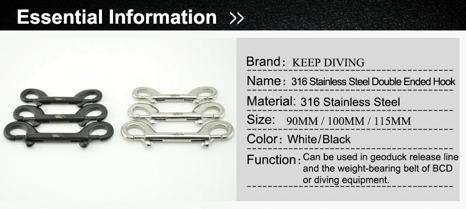 KEEP DIVING 316 Stainless Steel Double-Ended Scuba Diving Hook - BCD Equipment Accessory with Quick Draw Snap Bolt Kit (1 Piece)