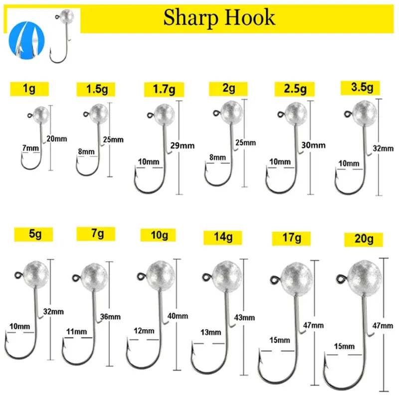 Round Head Jig Hooks for Soft Lure Fishing - Multi-Weight Pack (1g, 2g, 3g, 4g to 20g) - Premium Worm Bait Jigging Hooks for Crank Fishing