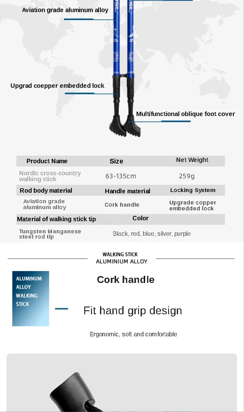 Size:Â Adjustable 63-135cm |Â Weight:Â Only 259g each |Â Material:Â Aviation-grade aluminum alloy |Â Colors:Â Black, Red, Blue, Silver, Purple