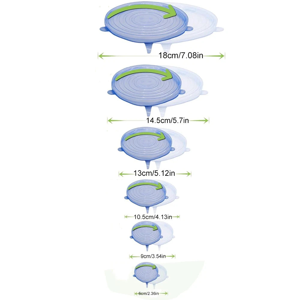 Six perfectly sized lids: 7.08", 5.7", 5.12", 4.13", 3.54", and 2.35" - covering all your storage needs from large meal prep containers to small snack bowls.