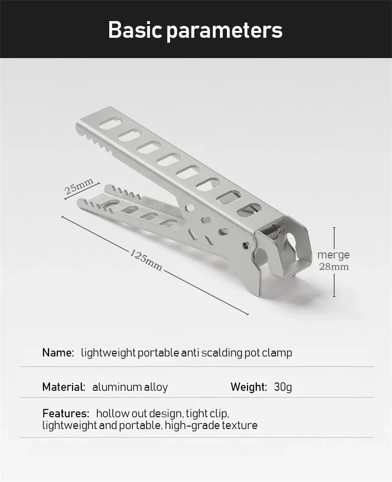 Never burn your hands again! This premium aluminum alloy pot clip is your ultimate companion for outdoor adventures and home cooking sessions.