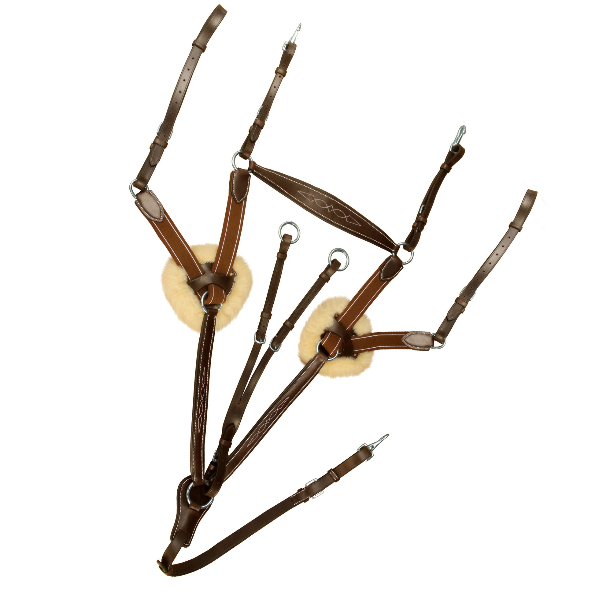 The 5 point design will naturally distribute the pressure over a larger area than a breastplate with just a couple of points of contact. It could also be said that 5 point breastplates don’t put as much pressure on the tree of the saddle when the rider jump. Use of original Sheep skin & fancy colour elastic leather amalgamated inserts at Shoulder.