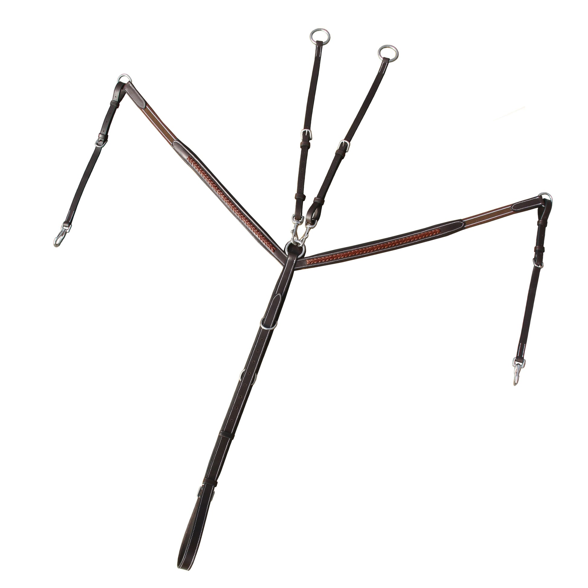 The running attachment on the breast collar is adjustable with a number of holes on it and on the chest strap. Snaps are provided on both ends to attach to the saddle.