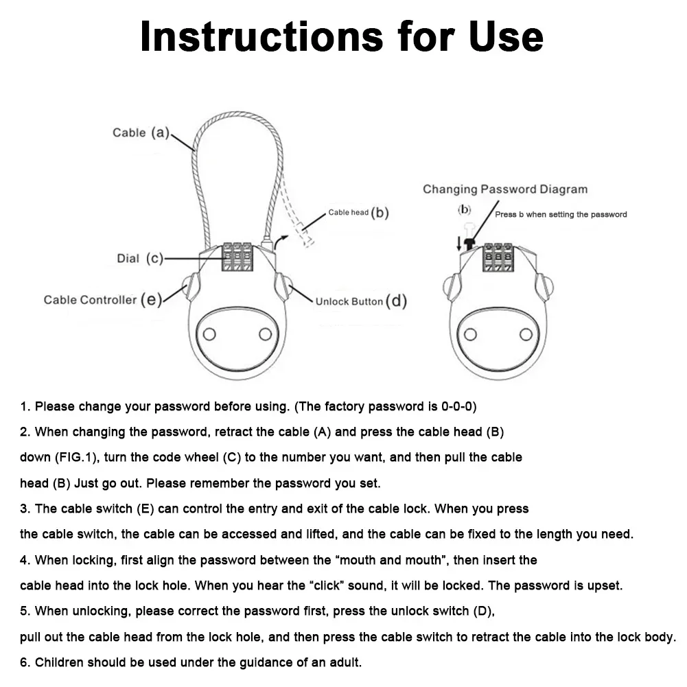 First-Time Setup: Change the factory password (0-0-0) before first use. Retract the cable fully, press the cable head down, rotate the code wheels to your desired combination, then release. Remember your password.