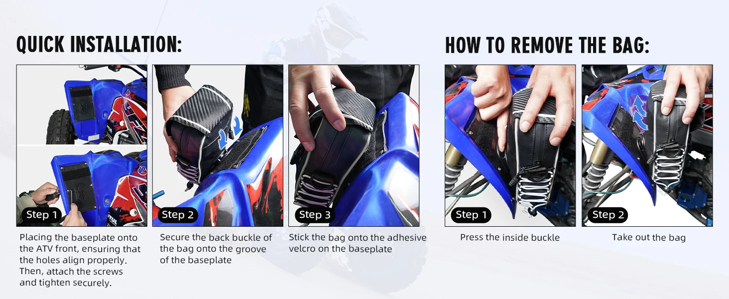 Whether you're deep in the backcountry or tearing up the dunes, keep essential tools, spare parts, and gear within arm's reach. Water-resistant construction protects your valuables from mud, dust, and weather while the front fender mount keeps weight balanced and handling sharp.