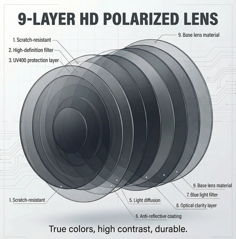 Polarized lenses eliminate harsh reflections off water, roads, and snow while boosting contrast and color accuracy. UV400 protection shields your eyes from harmful rays, and the integrated ND filter delivers crisp, comfortable vision whether you're fishing at dawn or driving into the sunset.
