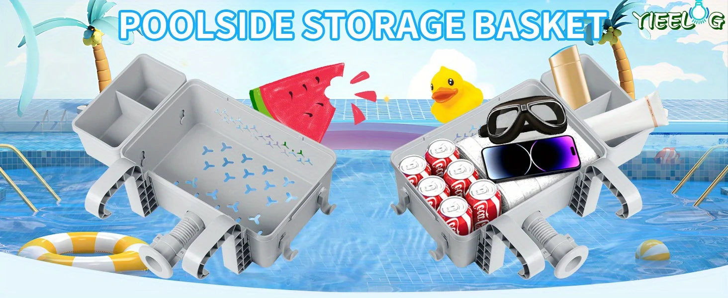 Premium Pool Storage Basket with Cup Holder - Heavy-Duty Plastic Organizer for Above Ground Pools & Outdoor Swimming