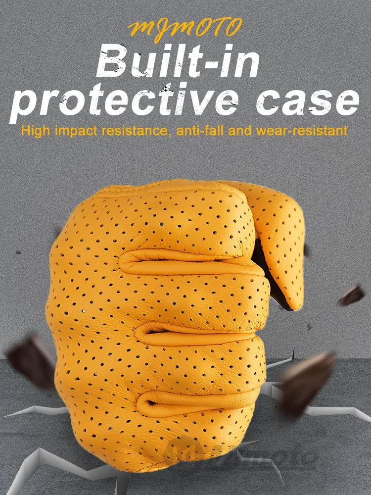 Breathable Perforated Leather Motorcycle Gloves - Retro Yellow Racing Gloves with Touch Screen for Men & Women - Motocross Motorbike Riding Gear